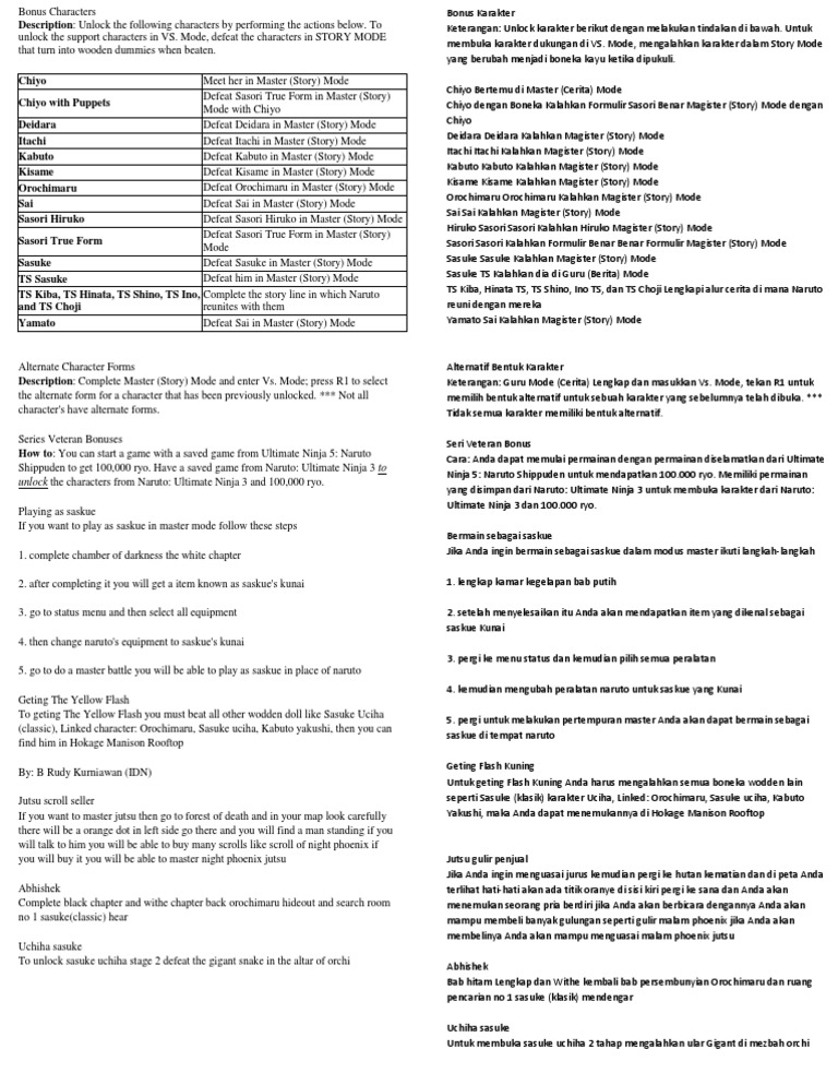 Cheat Naruto Shippuden Ps2 Unlock All Character - Berikut cheat naruto ultimate ninja 5 untuk ps2 yang bisa digunakan saat bermain ada karakter sasuke hingga deidara.. Clash of ninja revolution 3 cheats, codes, action replay . At the main menu do the following: Dombo012 · sasuke rpg mode. Ultimate ninja 3 cheats how to unlock characters in naruto shippuden ultimate ninja storm 3. · narutimate hero 3 characters.